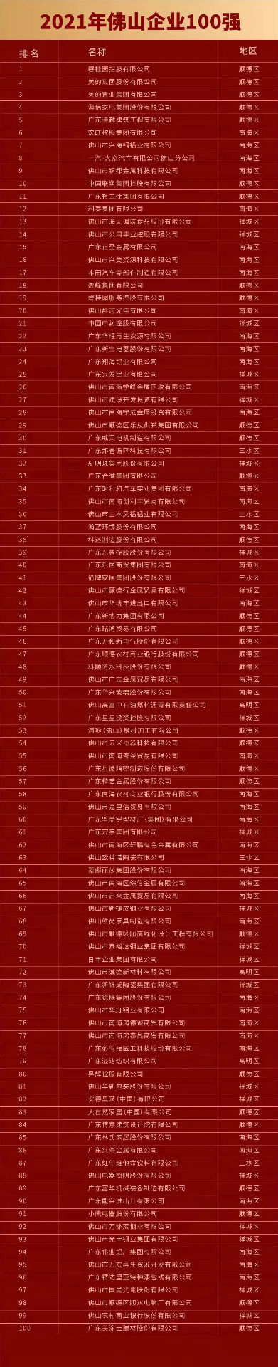 2021年佛山企業(yè)100強(qiáng)完整榜單如下:
