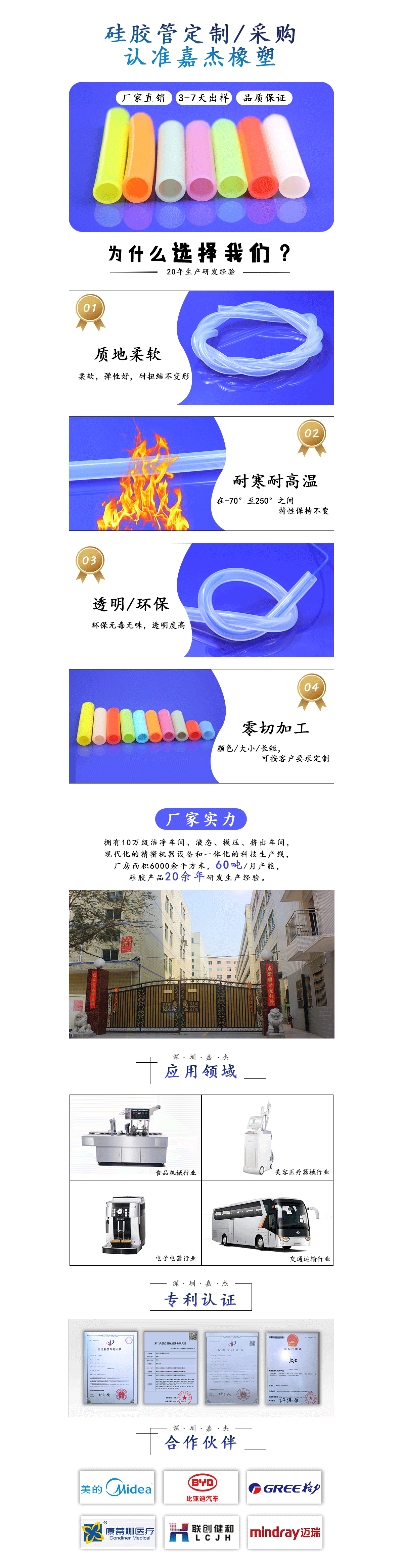 1.進口硅膠管有較強的耐高低溫性能,在高強溫下亦不會變形,產(chǎn)生有毒害物質(zhì)