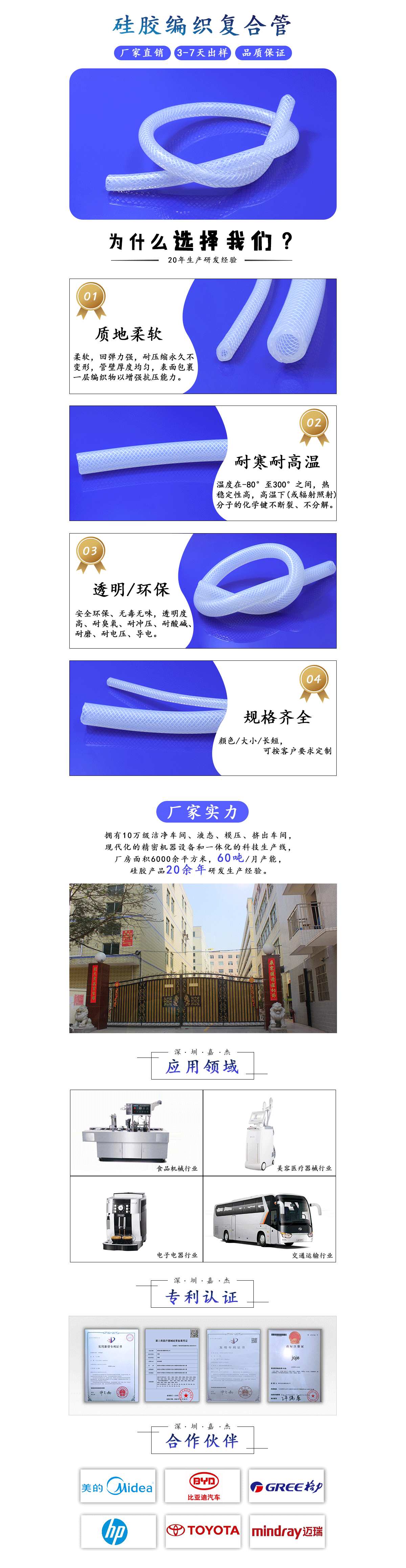 硅膠編織管復合管是一種纖維編織硅膠管,經硫化制成,管壁厚度均勻,表面包裹一層編織物以增強抗壓能力。、